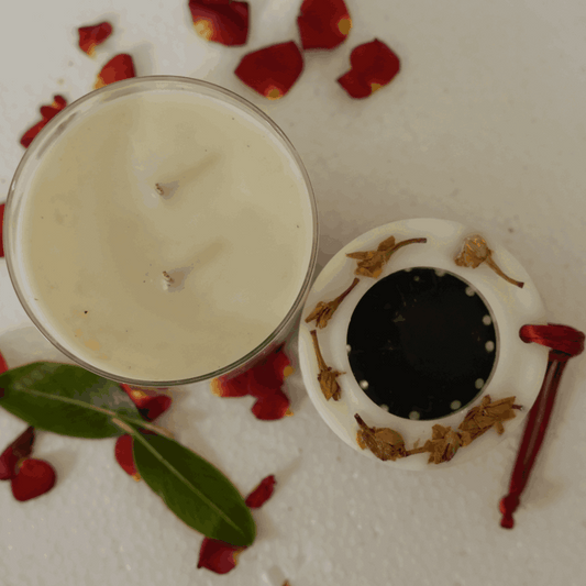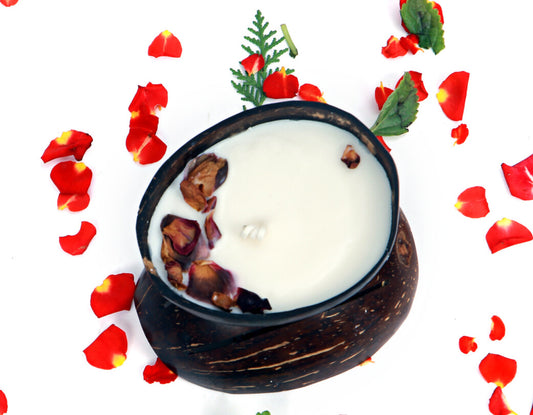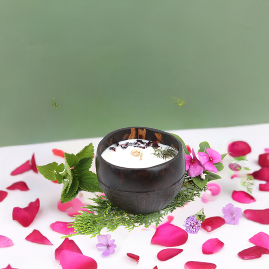 Beetroots Aromatic Soy Wax Candle in Natural Coconut Shell bowl with Dried Rose Petals, natural essential oils infused refreshing spa feel,100 gm plant based candle